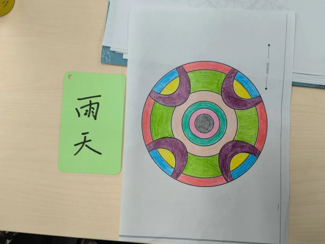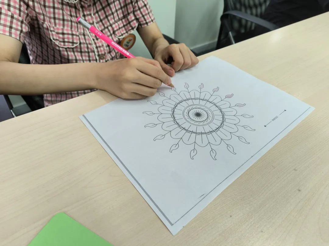 进入“感恩曼陀罗”环节,李老师简述曼陀罗(梵语“本质圆满”之意)从东方宇宙图腾到荣格心理学整合内心秩序工具的演变。成员们执笔浸染色彩,笔尖流淌间: