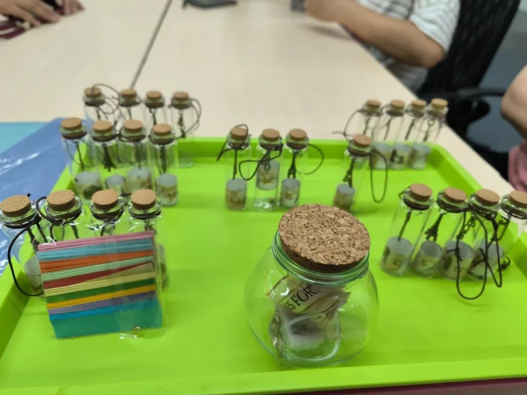 因时间调整,原“感恩漂流瓶”升级为“时光胶囊计划”。成员将未诉的感谢与待放的梦想写入彩签,小小容器既是爱的漂流瓶,也是希望的储蓄罐——那些未能说出口的暖意,在此刻获得安放的归宿。